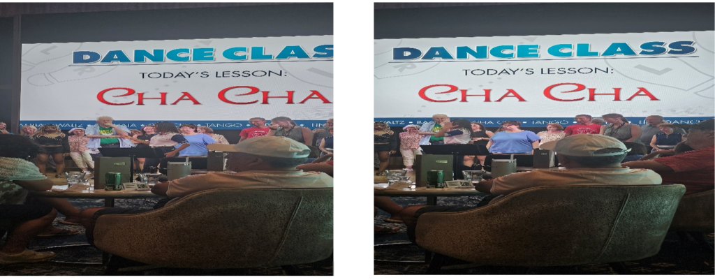 When we decided to call it quits, we went back to the cabin and met up with Bill and Jose and went to lunch. When we were finished, we went back to exploring the ship and the activities. It was then that we saw a lady doing Cha Cha lessons to a group of people.