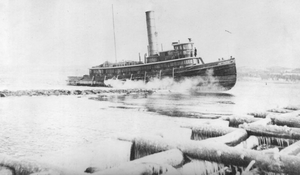 While boys were skating on the flats and about the docks Saturday afternoon, a Cornell tug that was acting as ice breaker for a tow of stone barges on its way down the river, after great effort, succeeded in breaking away into the steamboat dock in order to get a supply of fuel and water. In closer to the shore the ice was fully six inches thick. Few people had any idea John Frost had been so busy.