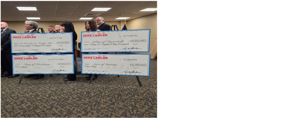 Infrastructure is a major issue around the country and local municipalities are left to foot the bill which many of them can’t afford. Congressman Mike Lawler was able to acquire $33 million for many of them in the 17th Congressional District to start or complete projects for their communities. He met with many of the leaders of these communities at the Clarkstown Town Hall on Monday March 9, 2026, to present them with very large sized “checks”.