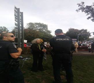 Many elderly participants struggled with the signs, some even holding them upside down. A familiar face from prior Lawler town halls — previously seen carrying Nazi imagery — appeared restrained, though a photo shows her appearing frustrated with the presence of the Clarkstown Police. (talking with police pic)