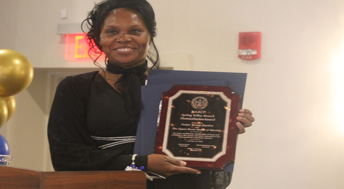 On October 18, 2025, the Spring Valley chapter celebrated its 70th Freedom Fund Celebration at the Crowne Plaza in Suffern. A number of people were recognized with awards for their contributions to their community. One of those honored was Reverend Teresa Darden and the Upper Room House of Worship for their service to the neighborhoods with their food pantries every Thursday and on some Saturdays around their Spring Valley church. She received the Humanitarian Award.