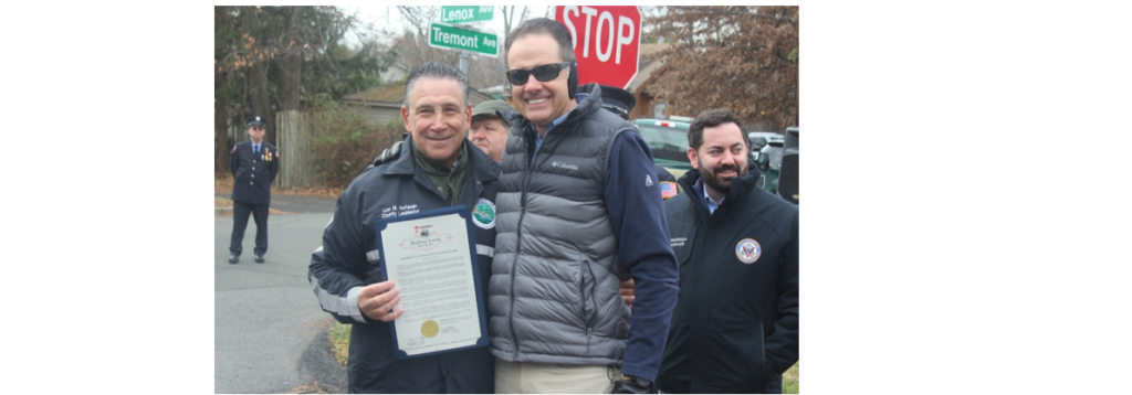 “Well, thank you, George. It’s an honor to join all of you today. It is a solemn but proud moment as we dedicate Lenox Avenue in honor of George Wohl. George was a lifelong resident of Congress and a 34-year-old member of the Congers Fire Department. The Wohl family has a long and distinguished history of service. His father, sons, brother, and nephew all served in the fire department and his wife, sister-in-law, and nieces served in the ladies Auxiliary.”