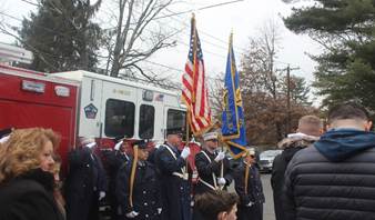Fire department color guard brought the flags up along the side street and stopped aside a fire truck.