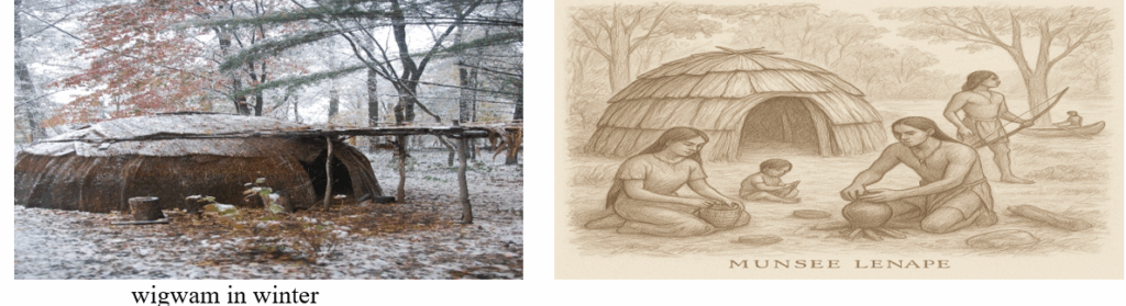 They lived in dome-shaped wigwam homes made from bent saplings covered with bark or reeds — clustered in small family groups. Children played along the riverbanks while elders taught them to fish, carve tools, weave baskets, and hunt game. The Lenape hunted deer, turkey, bear, rabbits, squirrels, and muskrats, using bows, arrows, snares, and traps. Every part of an animal was used for food, clothing, tools, or ceremonial purposes. Hunters offered thanks to Manitou for the gift of life.